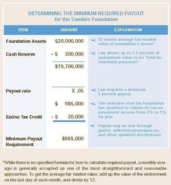 The figure below from Splendid Legacy 2: Creating and Re-creating Your Family Foundation illustrates some of the complexities of payout with a sample payout calculation for the Sanders Foundation.